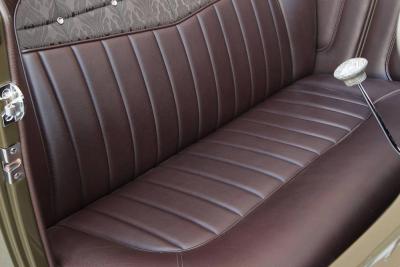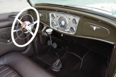 Cory Taulbert flew out to NorCal to wire up the roadster using pieces from Rhode Island Wiring Service harness and an Enos panel, and Sid Chavers created the bench seat in the car before covering it with sections of leather as well as a fabric insert piece from a 1969 Cadillac.