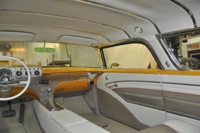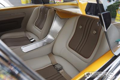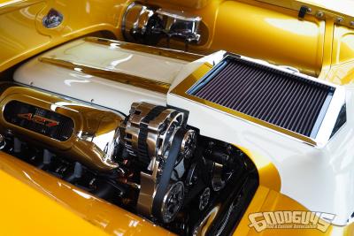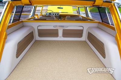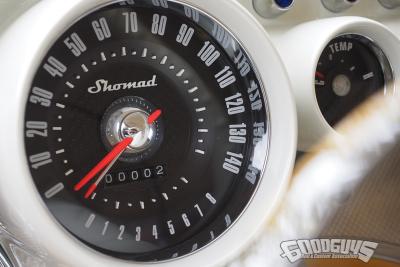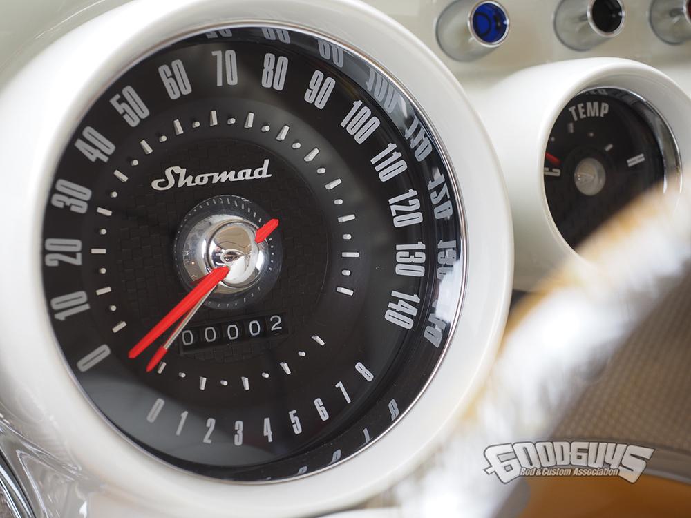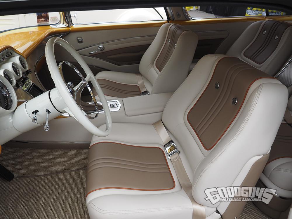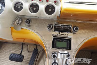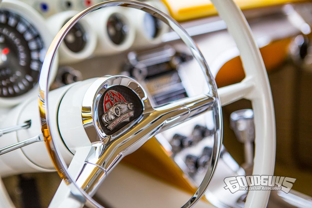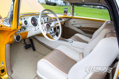 Inside, Ron's seating request was achieved using a quartet of 2000 Monte Carlo buckets, sculpted and reshaped by Gabe's Custom Interior in San Bernardino, California before being custom stitched in Irish Cream and Mocha colored leather with copper piping accents. A hand-built console bisects the seating and is home to a Gennie shifter and controls for the air conditioning and RideTech shocks. The console flows into the original dash, using custom trim and the original-style waffle-pattern stainless insert material to keep everything looking integrated. The A&M crew also extended the raised dash area over the gauge cluster to accommodate two extra gauge pods on the right side of the speedometer. The gauges themselves are from CON2R and mimic OEM '57 styling, but with Shomad lettering. Similarly, the American Retro steering wheel mirrors the original, but in a smaller diameter and with a custom A&M logo center insert.