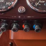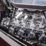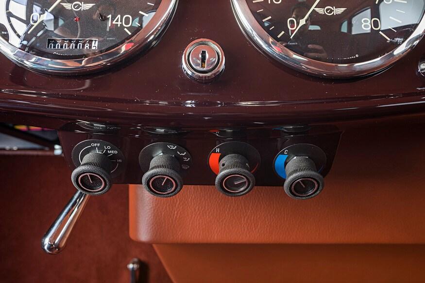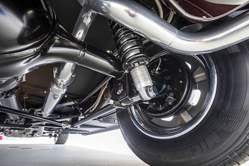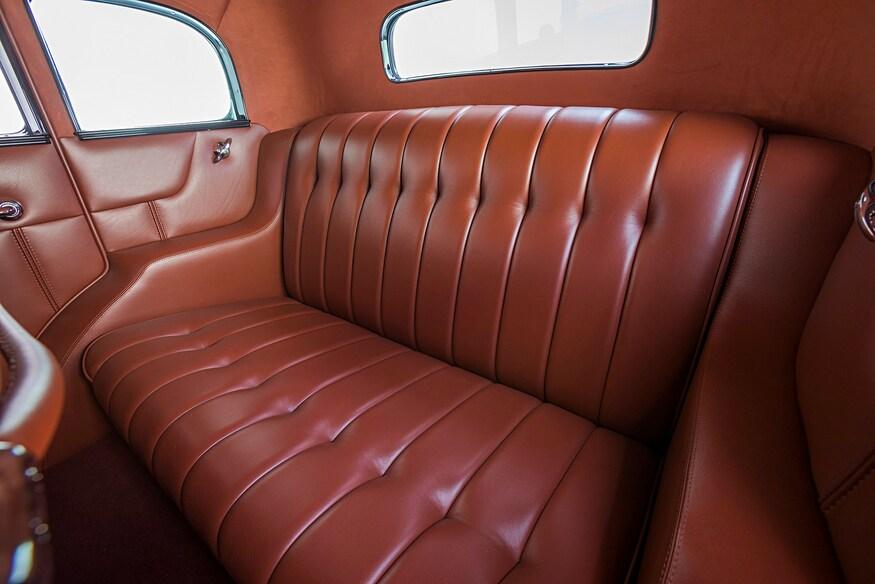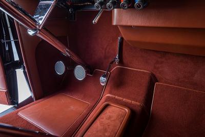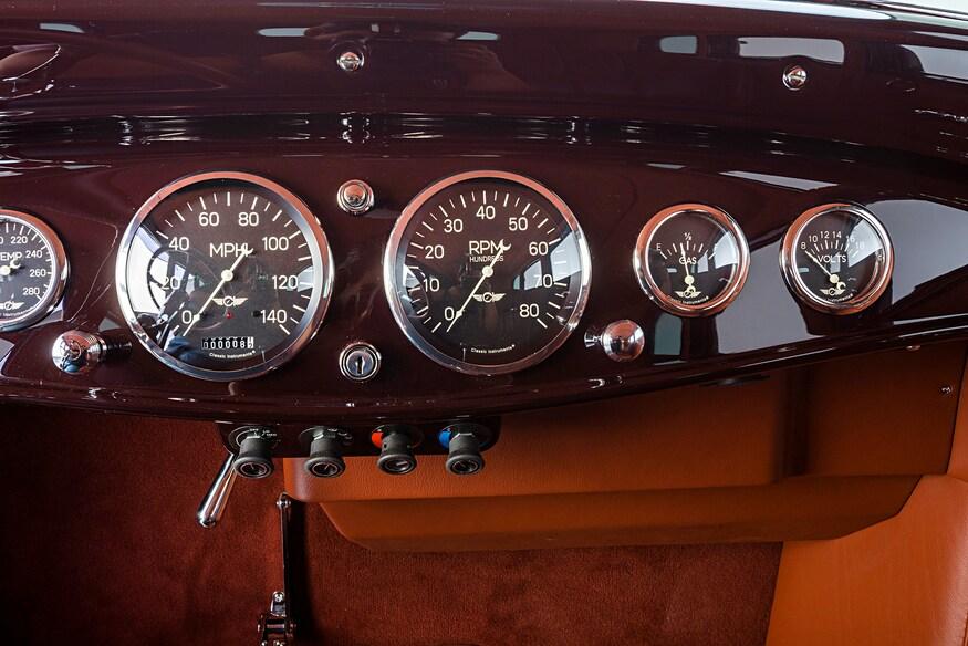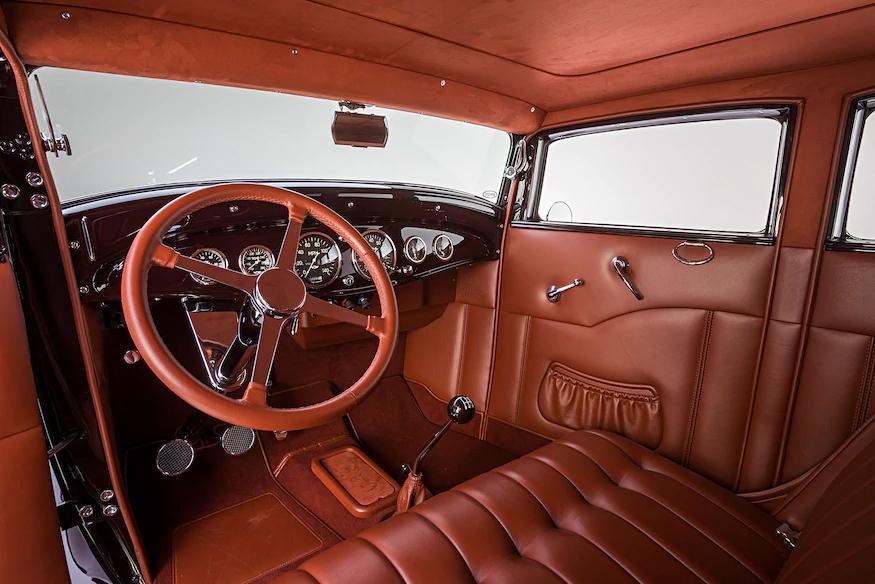 Upholsterer Sid Chavers in Santa Clara is one more regular collaborator with Roy Brizio. Chavers finished the sedan's original front bench seat, custom rear seats, and custom door panels in brown, pleated leather. Matching suede was used on the headliner and the floor was covered with Mercedes wool carpeting. A leather-grip four-spoke Sprint steering wheel from LimeWorks tops a Mullins steering column. A set of Classic Series gauges from Classic Instruments are the perfect choice to fill the factory dash. Vintage Air A/C and controls are mounted underneath.