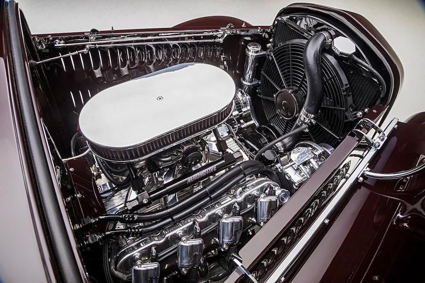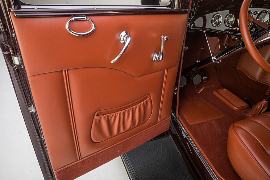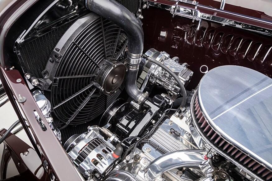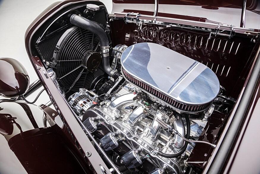 Nick said that the build didn't start with a predetermined concept in mind. Instead, the project evolved through a series of conversations and decisions over the course of the build. He knew he wanted a healthy chop out of the original Ford steel top. Four inches is ambitious but looks right. Three rows of small louvers in the Jack Hagemann three-piece aluminum hood was preferred over larger louvers, which would look more "street rod" than the car needed, and OTB Gear 682-J guide-style headlights have longer housings that are better suited for the full-fendered car. Other exterior elements include the Johnson's Hot Rod Shop 1932 Ford taillights, Bob Drake Reproductions bumpers, Dan Fink grille insert, and Vintique repro door handles.