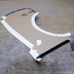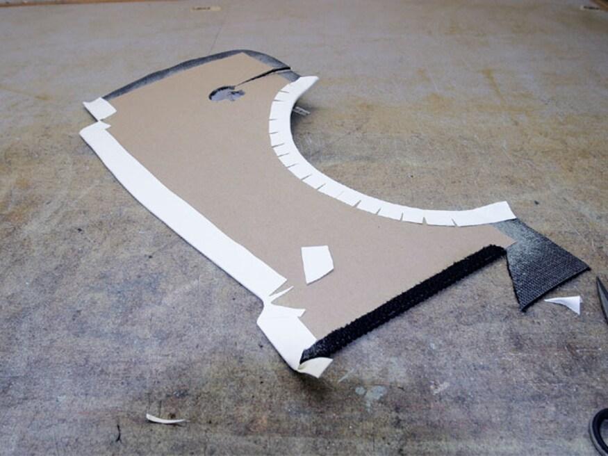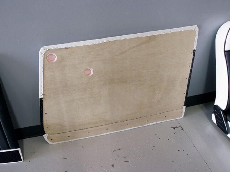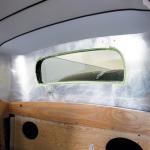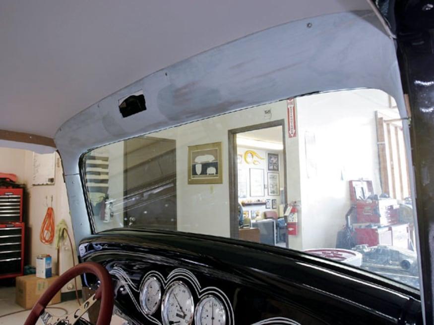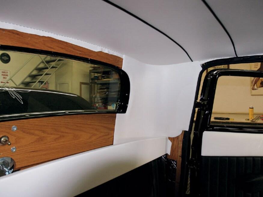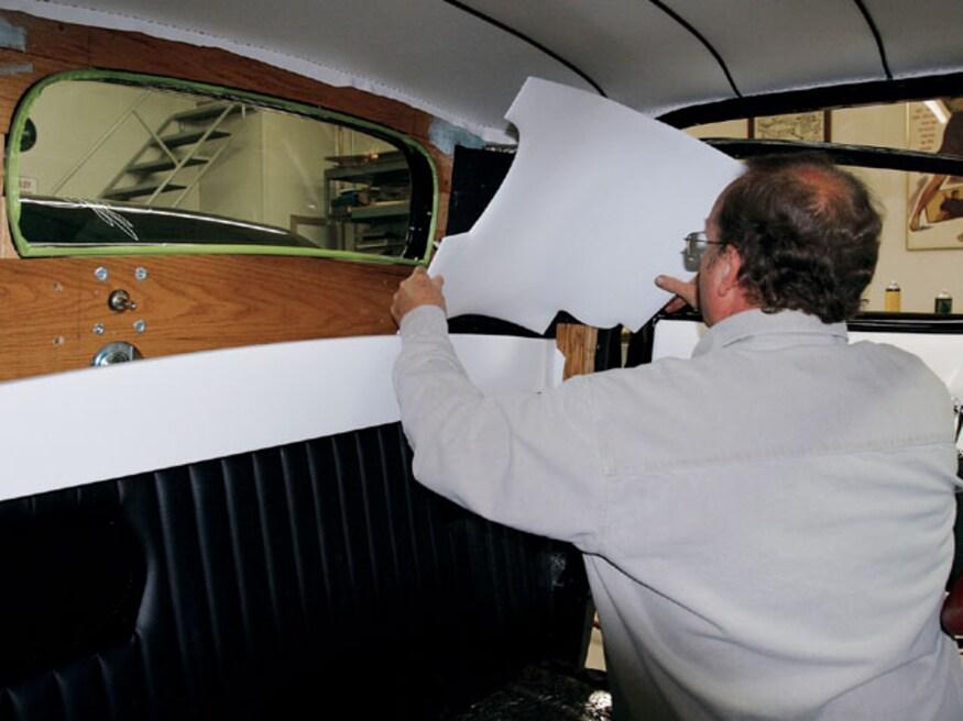 All the interior panels of our coupe were built from scratch. Generally, these pieces are based on one of three types of material-waterproof panel board, chipboard (a heavy cardboard), or 1/8-inch mahogany. Aluminum is used in some cases where the panel has to hold its shape. Aluminum panels were formed for the rear corners of the body, the header above the windshield, and the cover for the air conditioning hoses. Mahogany doorskins were used for door and kick panels; inexpensive and easy to work with, after being covered with upholstery material, they are held in place by modern plastic panel retention clips.