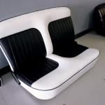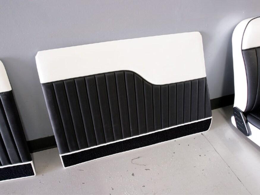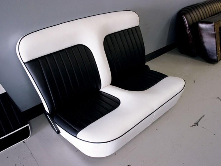 There are a number of choices when it comes to choosing a seat-an original can be redone, a built-in can be fabricated, or the route we chose, an aftermarket bench design from Wise Guys. Built with 16-gauge steel frames, Wise Guys seats are available in solid and split-back bench designs, as well as buckets. An array of features come standard, including no-sag springs, multi-density foam, reclining mechanisms, fold-down center armrests, and 12-volt power receptacles, to name a few. In addition, power slide, power six-way pedestals, power lumbar supports, and seat heaters are optional. Sid re-covered the seat with black pleated inserts surrounded by smooth, white vinyl to follow the McMullen theme.