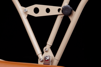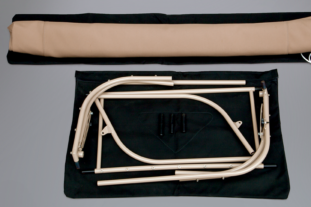 The steel frame is covered with colorfast Haartz convertible top material that is available in 15 different colors. The liner is either tan or black, and the frame is powder coated to match. Assembly and disassembly takes minutes, and the entire frame stows away in two compact, durable cases designed to prevent parts from rubbing against each other during travel. Selflubricating Delrin dowels make it easy to connect and disconnect the top bows.