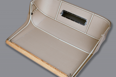 The top skin is made of Haartz Stayfast, a three-layer composite material with an acrylic square-weave outer fabric over a rubber inner layer. It's available in 15 different colors that match or complement many paint finishes. The inner lining is either black or tan cotton, and the steel frame is powder coated to match. Sid and George chose the Haartz material because it's durable, it holds its shape, and it carries a lifetime guarantee against fading. Though at first Sid stitched the tops in-house, today they're made in Denver, Colorado, by a company that specializes in manufacturing convertible tops. "They're made just like a factory production top, with durable heat-seamed and sealed seams," he says.