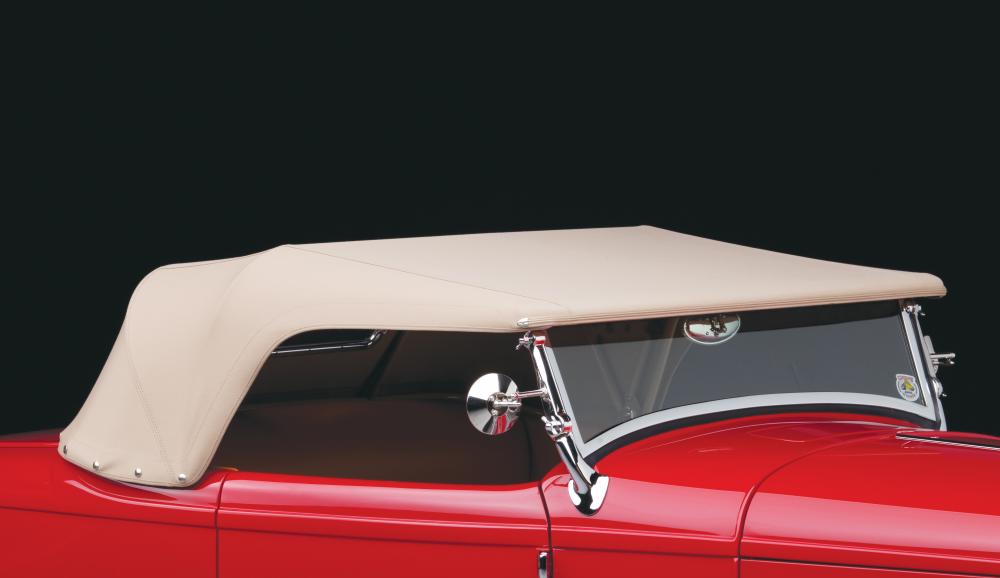Anyone who's owned a roadster with a stock-style folding top knows that they can be problematic. The top bows need to be modified to work on a chopped car, and even on roadsters with stock height windshields, folding tops tend to look too upright and boxy without some work. Once they've been modified, they usually won't fold down all the way, resulting in an unsightly bunch of material that decreases visibility. The solution is to either have the top on or off, but fitting a folding top in the trunk is no easy task. Even if you can do it, forget about having any extra room for a duffle bag or cooler. And then of course there's the damage caused by the top rubbing against the paint wherever it comes in contact with the body.