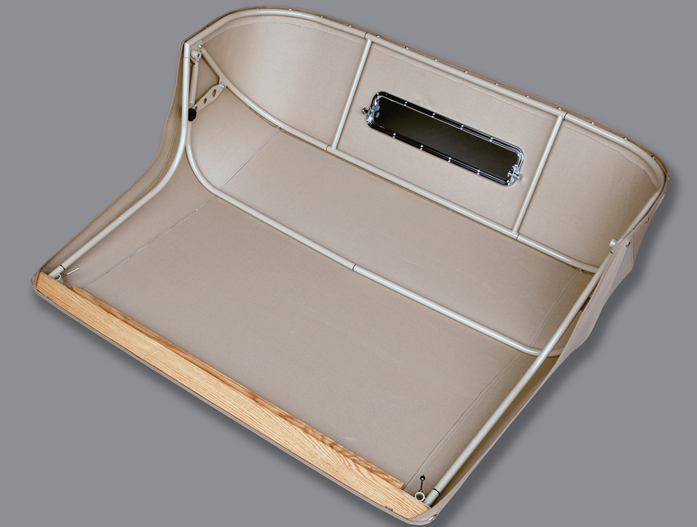 Six years ago they introduced a removable rear curtain fitted with the HotSlot window. It lends an even more authentic, vintage look, and also increases visibility and airflow. The curtain straps inside the top above the window opening, allowing it to hang down and snap in place across the bottom of the frame. A separate trim piece covers the frame when the curtain is removed.