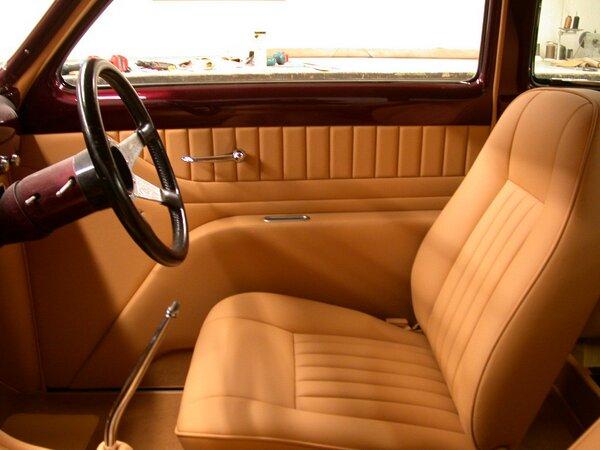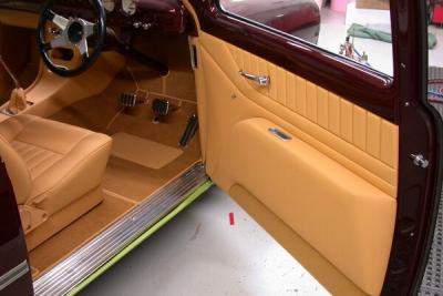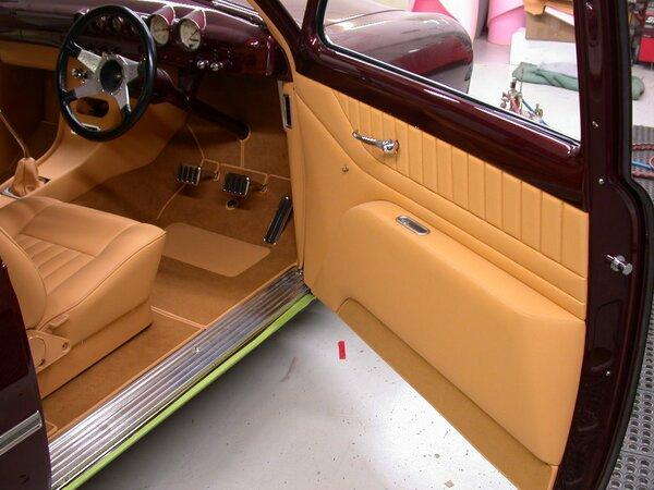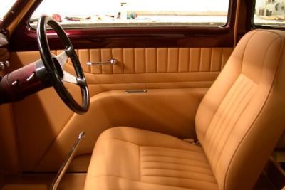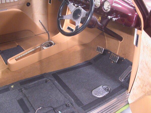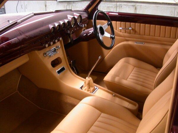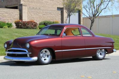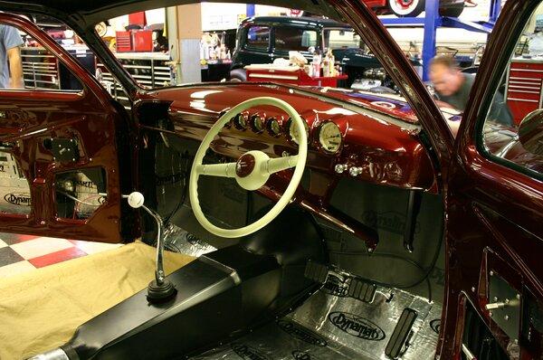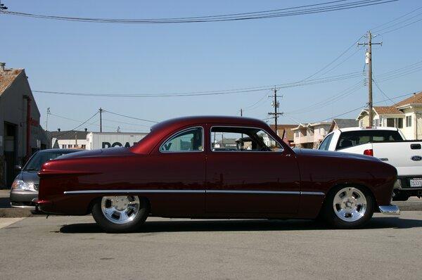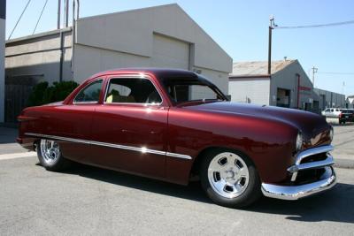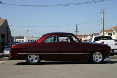 Eric's latest project to roll out of the Brizio shop is a subtle '49 Ford. Another exercise in subtlety, the top has been chopped 1 & a half inches, the front end is raked 2 inches, and the deck lid is lengthened 5 inches toward the rear window. Topped off with a shaved hood, doors and trunk, and the stock trim going down the side, this is one clean shoebox.