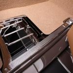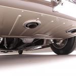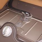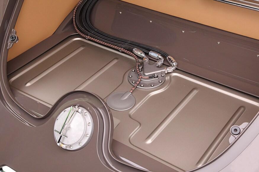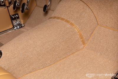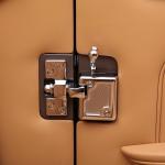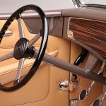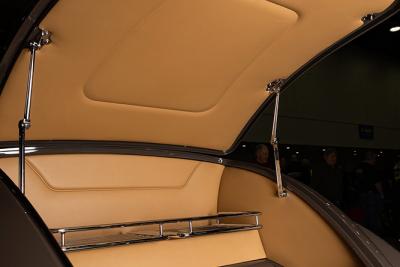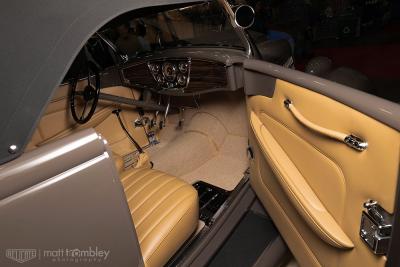 The interior was a design collaboration of Eric Black and Sid Chavers; the 1936 was shipped to Sid Chavers Upholstery in Santa Clara, California, where Chavers custom-built the bench top/bucket seat bottoms from the seat frames up to mount on Pinkee's machined billet tracks. Relicate leather in a color named Walnut Shell was used throughout. Hand-laced eight-braided leather was used for the door pulls and chromed vintage MG-style exposed latches hold the doors shut; the armrests are full length. Vibro Solutions sound damping lies below foil-backed jute all as underlayment for German square-weave wool carpeting.