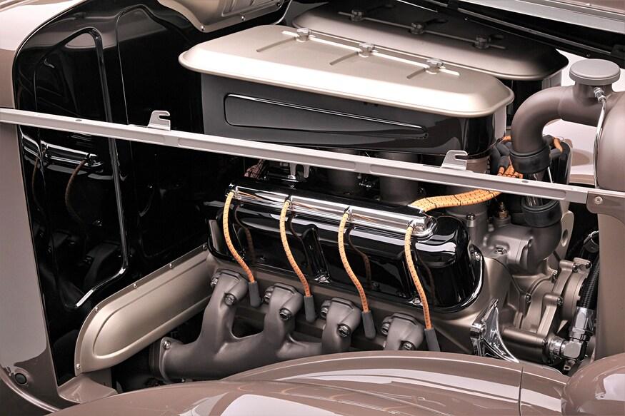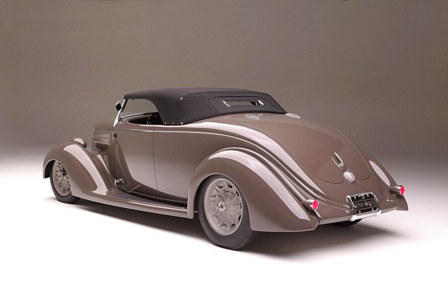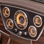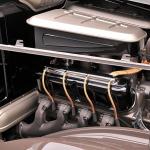 Inspired by the French Delahaye, Pinkee's machined the four-spoke steering wheel from a slab of billet aluminum, then Sid Chavers wrapped the outer rim in leather. The bespoke Classic Instruments are set into a radius-cut crosshatched gauge cluster placed central in a Macassar ebony veneer inlaid over a machined billet aluminum dashboard. The working folding top is made of stainless steel and wood bows chopped 3 inches to meet up with a 2-1/2-inch chopped 10-degree raked windshield. Chavers covered the top with Haartz Stayfast square-weave cloth topping. The flow-through ventilation opening rear window is a Chavers Cool Slot.